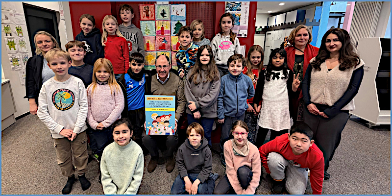 Stefan-Oliver Strate und Anna Driller, Leiterin der Kinderbibliothek, hießen die Kinder herzlichen willkommen und sprachen ihre Bewunderung für die eingereichten Bilder aus. „Ich freue mich, dass ihr mir eure Bilder vorstellt und ihr so bunt und kreativ gemalt habt“, lobte der Bürgermeister die Klasse für ihre Werke. Anschließend überreichte er den Kindern ihren Gewinn: Einen Gutschein für eine Märchenstunde für die ganze Klasse, der mit großen Augen und freudestrahlend in Empfang genommen wurde. Im Anschluss an die Ehrung hatten die Kinder noch Zeit, um dem Bürgermeister einige Fragen zu stellen.